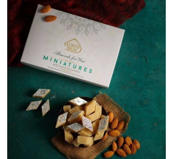 Buy onine Mini Badam Burfi - 375 gms from almond house ata indiansbaskets. Ingredients: badam or almonds, sugar ghee.